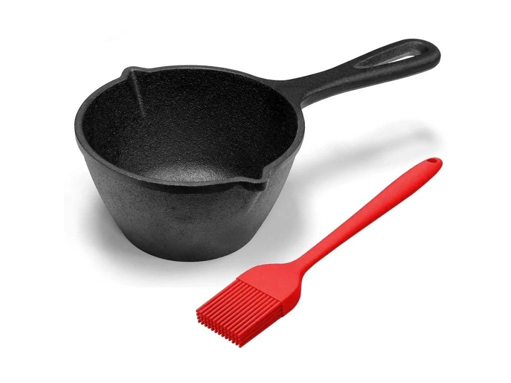 Litinový rendlík s výlevkami 0,5 l + silikonový štětec. Univerzální použití na všechny typy sporáků, v troubě i na ohni Ideální pro marinády, omáčky a rozpuštění másla