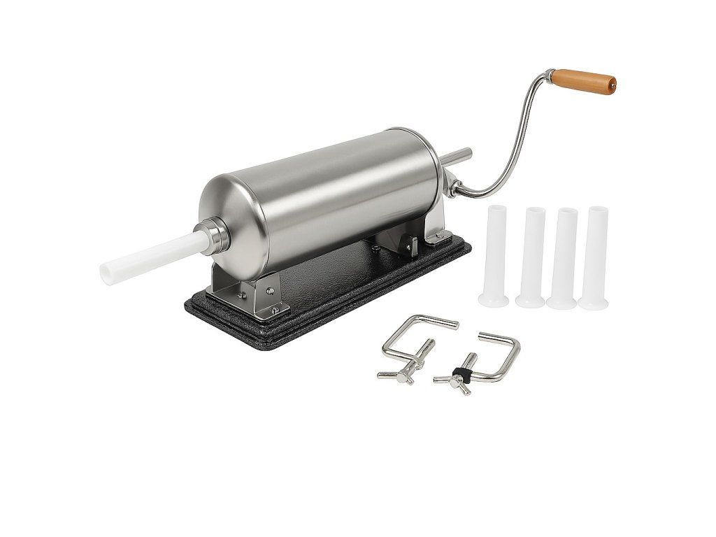 Vertikální plnička na jitrnice a klobásy – kapacita 3 kg masa. Nerezová konstrukce s dřevěnou rukojetí a 4 nástavci (Ø 15–25 mm) pro různé druhy uzenin. Kompaktní, snadno čistitelná a ideální pro domácí výrobu.