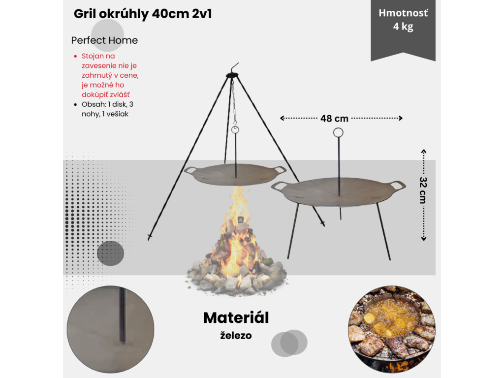Kulatý gril 2v1 o průměru 40 cm – lze použít jako klasický třínožkový gril nebo zavěsit na stojan ke kotlíku. Ideální pro univerzální grilování v přírodě i na zahradě.