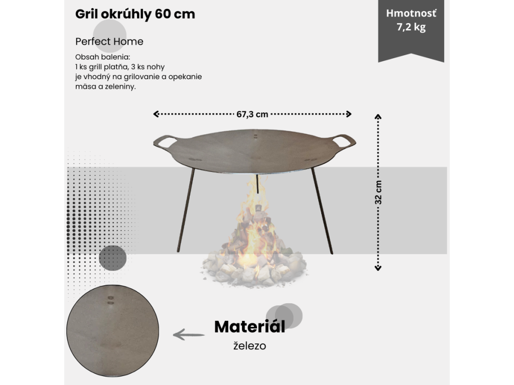Popis: Tento kovový grilovací plát o průměru 60,5 cm je určen pro grilování a opékání masa, zeleniny či sýrů nad otevřeným ohněm. Masivní železný materiál zajišťuje vynikající akumulaci tepla a rovnoměrné propečení potravin. Díky demontovatelným nožkám je manipulace jednoduchá a plát se snadno skladuje i přepravuje. Ideální doplněk pro zahradní grilování, kempování či opékání v přírodě.
