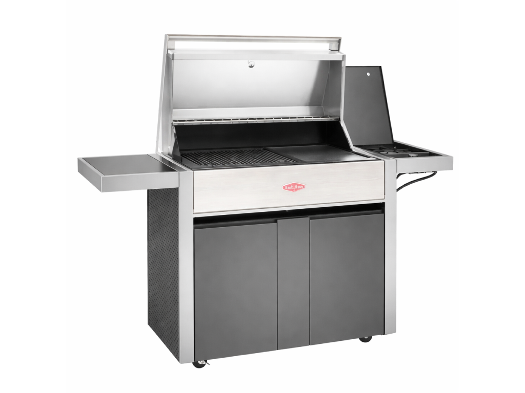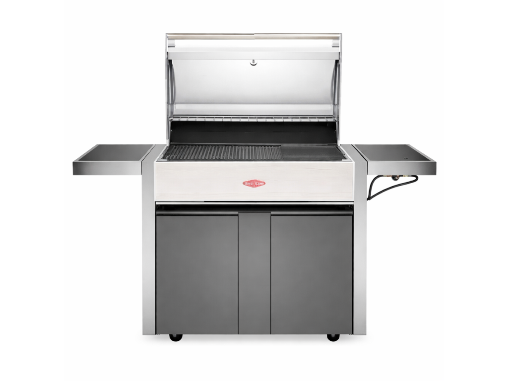 Popis produktu: Gril je postaven na hliníkovém vozíku s tepelně odolným lakem a je navržen pro umístění EU plynové láhve včetně odpovídající výšky prostoru v podvozku. Litinová grilovací plocha s RF technologií a „saténovým“ povrchem zajišťuje rovnoměrné rozložení tepla. Integrovaný boční hořák (wok) o výkonu 4,2 kW je vhodný pro rychlou přípravu příloh, omáček nebo wok pokrmů. Konstrukce obsahuje 4 samostatné ventilační prvky z nerezové oceli pro správné proudění vzduchu.