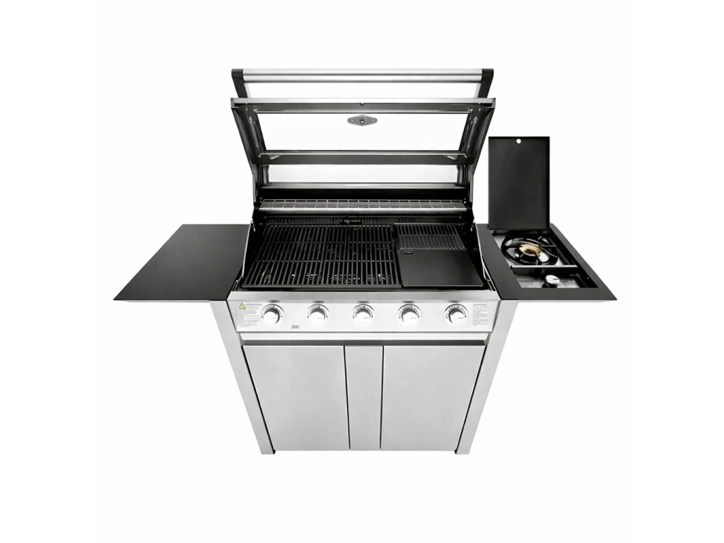 Popis produktu: Gril je osazen 5 hlavními hořáky a bočním wok hořákem o výkonu 4,2 kW. Litinová grilovací plocha s RF technologií a „saténovým“ povrchem je rozdělena na část 640 mm rošt a 320 mm plná deska. Stabilní hliníkový vozík s tepelně odolným lakem umožňuje uložení EU plynové láhve. Konstrukce obsahuje 4 samostatné ventilační prvky z nerezové oceli pro správné proudění vzduchu.