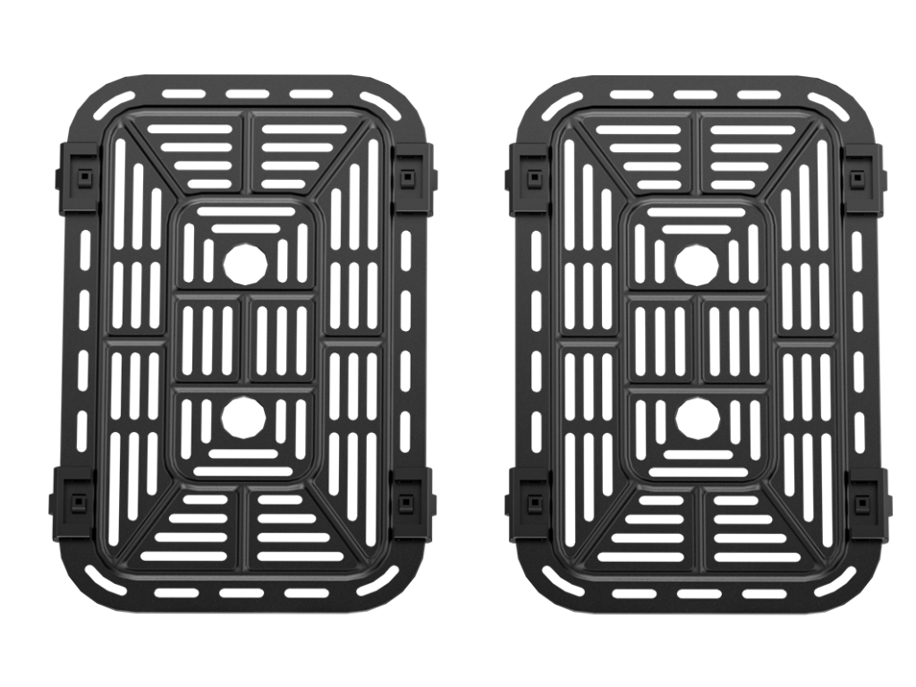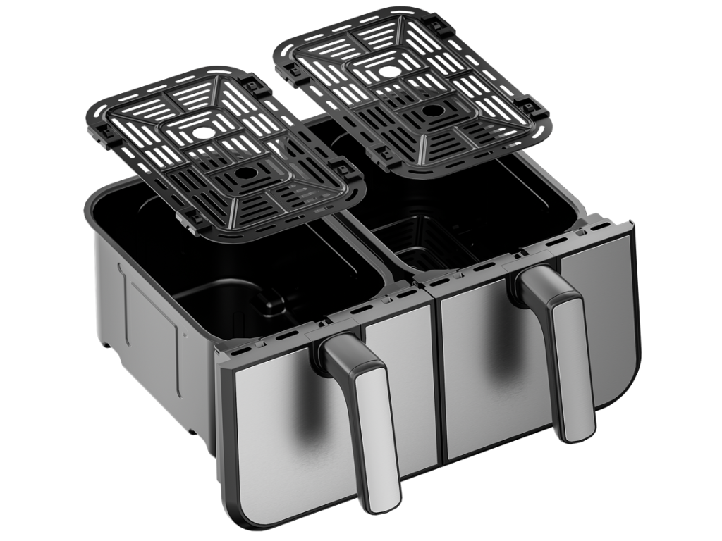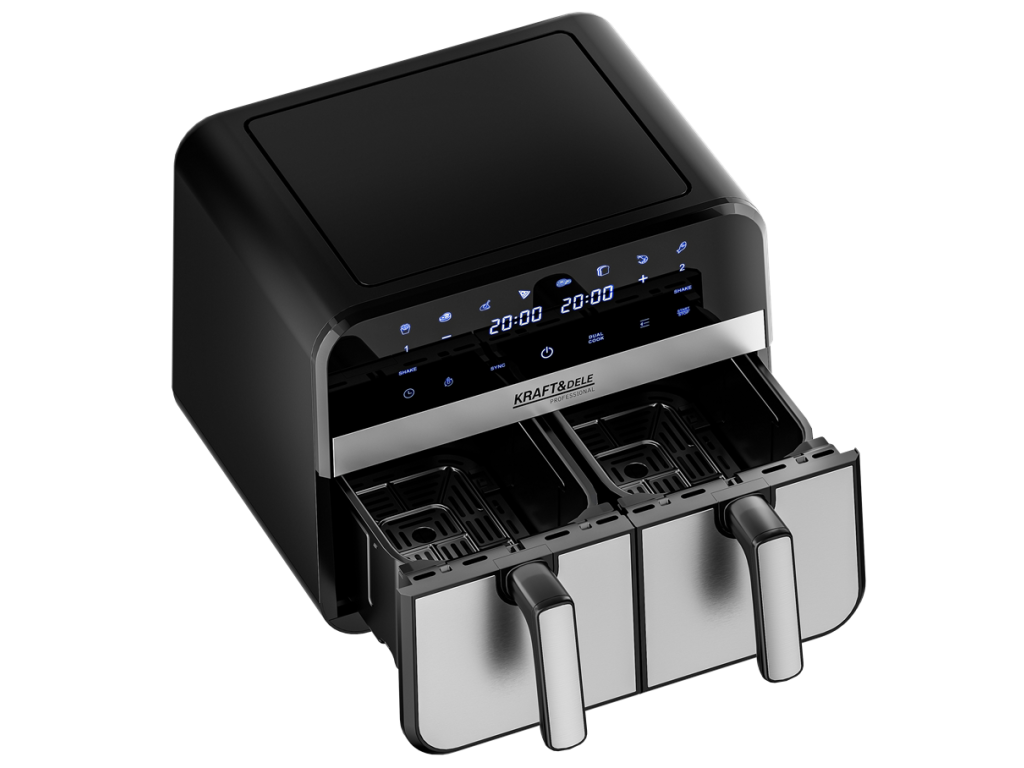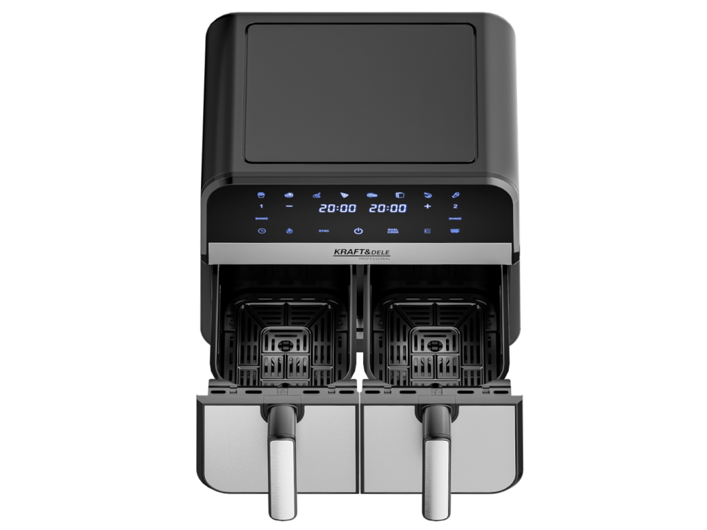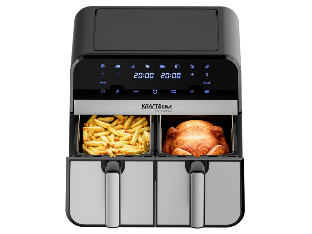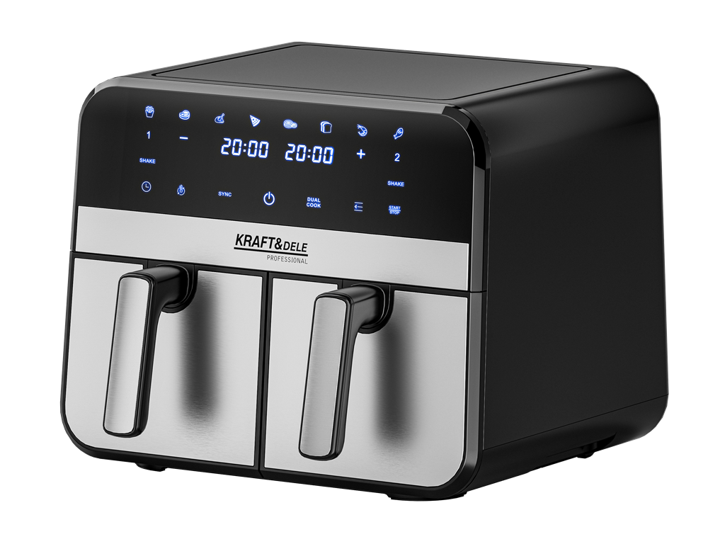 Dvojitá horkovzdušná fritéza s celkovým objemem 9l, 2500 W výkonem a 8 automatickými programy. Umožňuje vařit dvě různá jídla současně – zdravě, rychle a téměř bez oleje.