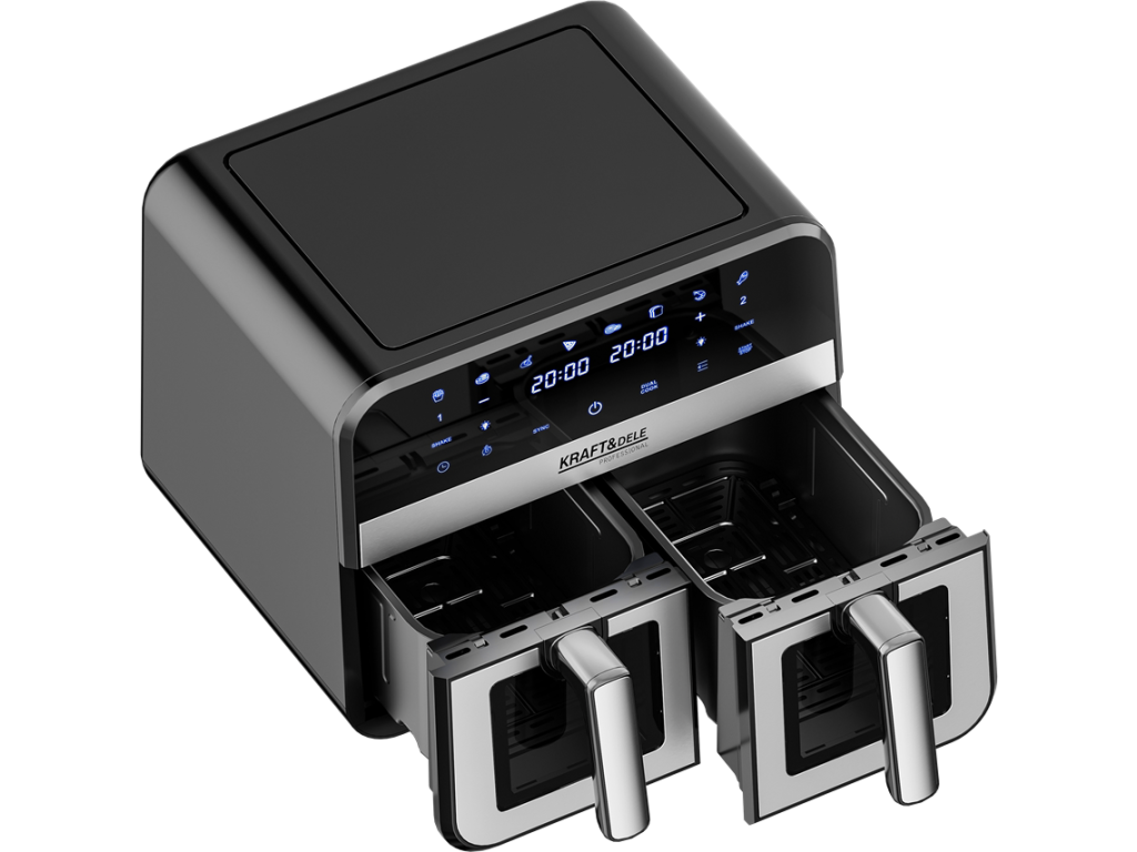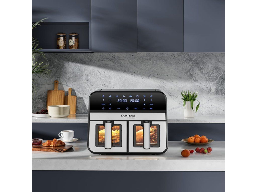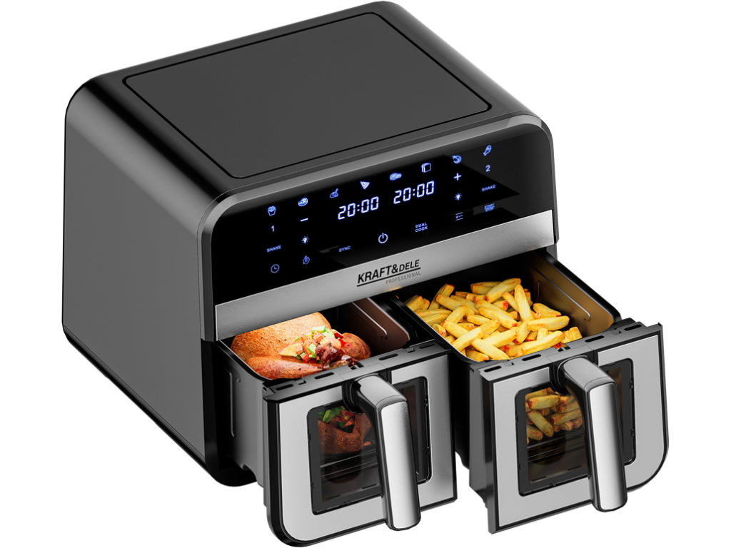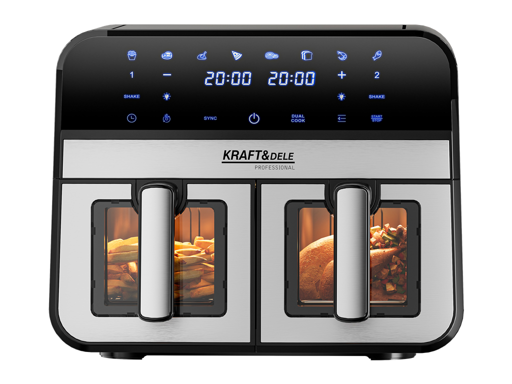 Dvojitá horkovzdušná fritéza 9l s funkcí SYNC, 2500W, programy pro oblíbená jídla, LED dotykovým panelem a okénkem pro kontrolu vaření. Zdravé smažení a pečení bez oleje.