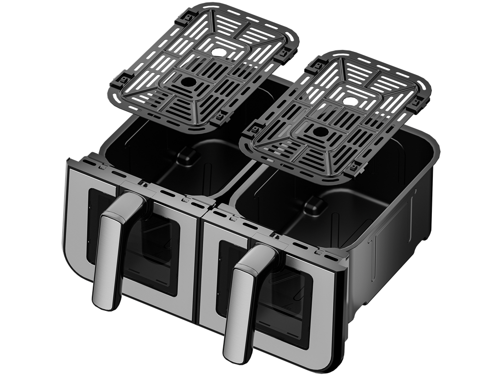 Horkovzdušná fritéza s dvojitou varnou zónou a celkovým objemem 9 litrů umožňuje zároveň připravit dvě různá jídla – ideální pro rodiny a každodenní vaření bez oleje.