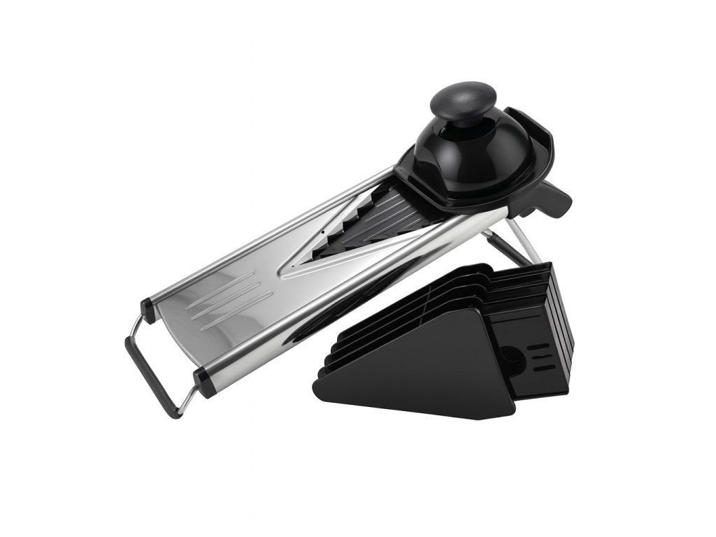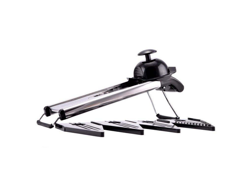 Univerzální V-kráječ s pěti výměnnými nástavci na tenké i silné plátky a julienne proužky. Stabilní, ostrý, snadno použitelný a ideální pro rychlou přípravu zeleniny i ovoce.