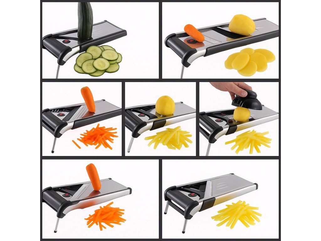 Popis produktu: Mandolína je vyrobena z kombinace kvalitního plastového těla a nerezové oceli, což zajišťuje dlouhou životnost, stabilitu a ostré řezy. Sada obsahuje tři krájecí vložky pro plátkování o různých tloušťkách (1,5 mm / 2,5 mm / 3,5 mm) a dva nástavce pro julienne krájení (3 mm a 7 mm). Součástí je také bezpečnostní ochrana prstů pro bezpečné používání.