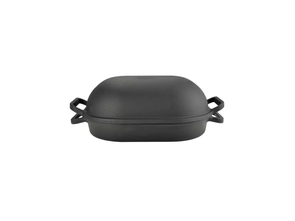 Litinový pekáč s litinovou poklicí 2v1 je vyroben z čisté litiny, která dokonale rozvádí teplo po celé své ploše a je výjimečně odolná vůči vysokým teplotám.