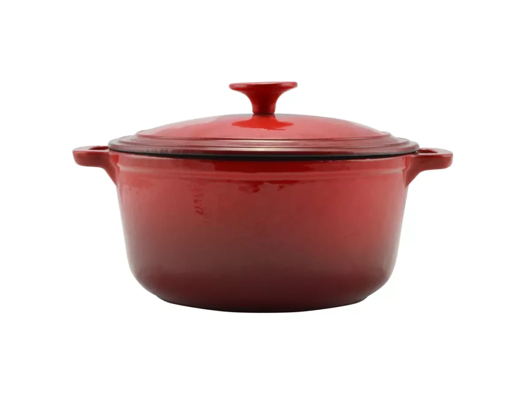 Smaltovaný litinový hrnec s poklicí 6,5 l – červený je vyroben z čisté litiny, která dokonale rozvádí teplo po celé své ploše a udržuje jej po dlouhou dobu. Litinové nádobí je mimořádně odolné vůči vysokým teplotám a zároveň přirozeně obohacuje pokrmy o železo, které je důležité pro správnou funkci organismu.