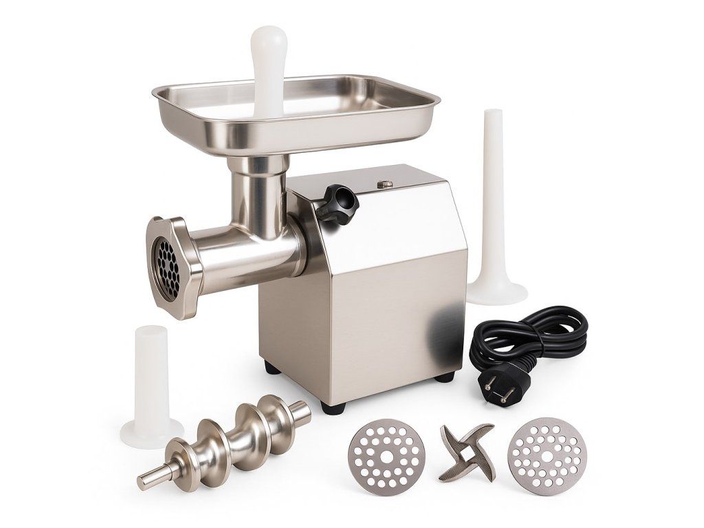 Profesionální celonerezový mlýnek na maso INOX 8″ – výkon 2500W a kapacita 230 kg/h. Odolný nerezový mlýnek s kovovou hřídelí a plynulým chodem Ideální volba pro restaurace, řezníky i domácí výrobce
