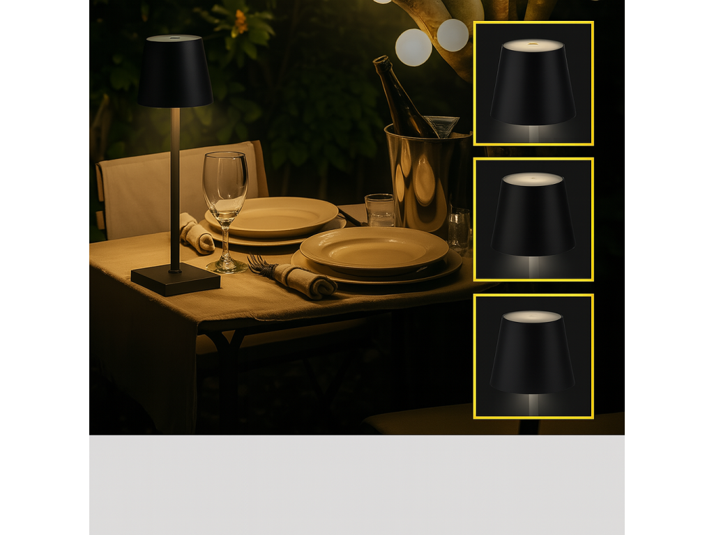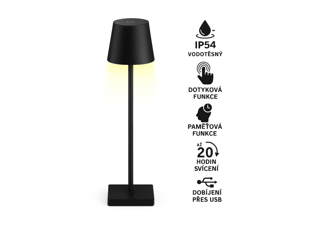 Přenosná LED lampa – moderní design pro interiér i exteriér Vodotěsná konstrukce IP54, dotykové plynulé stmívání Vestavěná baterie s výdrží až 20 hodin, nabíjení přes USB-C kabel (1 m)