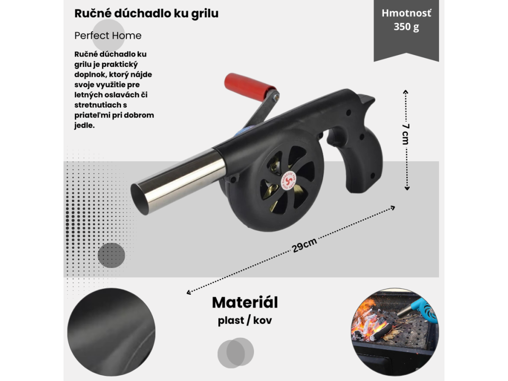 Popis: Ruční dmychadlo ke grilu je ideální doplněk pro letní oslavy a grilování s přáteli. Zajistí dostatek vzduchu pro rovnoměrné hoření a stabilní teplotu. Díky ergonomické rukojeti a odolné konstrukci z plastu a kovu se s ním snadno manipuluje.