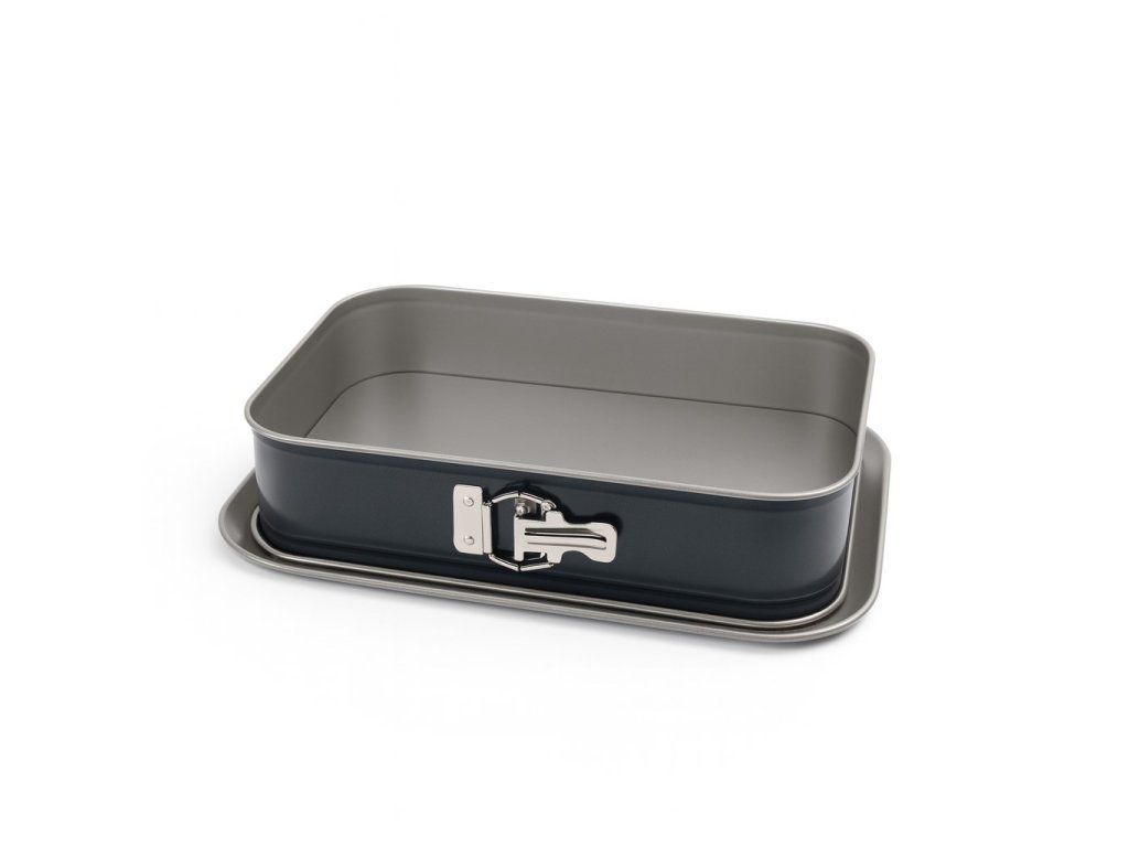 Popis produktu: Forma je vyrobena z kovu s nepřilnavým povrchem, který usnadňuje vyklápění moučníků a čištění po pečení. Rozměry formy jsou 35×24×8 cm, podnos má rozměr 39×27,5×1,5 cm. Díky praktickému zacvakávacímu mechanismu lze bok formy snadno odepnout a spodní část využít jako servírovací tác.