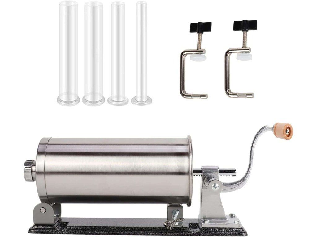 Vertikální plnička jitrnic a klobás – kapacita 5 kg masa Robustní provedení z nerezové oceli a odolného plastu pro celoživotní provoz Součástí 4 plastové nástavce (Ø 17, 21, 25, 29 mm) pro různé druhy uzenin