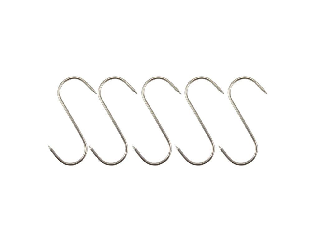 Nerezové háky (5 ks) o délce 13 cm – ideální pro domácí zabíjačky, uzení masa, zavěšení špeku nebo jiná kuchyňská a hospodářská použití. Vyrobeno z kvalitní nerezové oceli, snadno se čistí a jsou odolné proti korozi.
