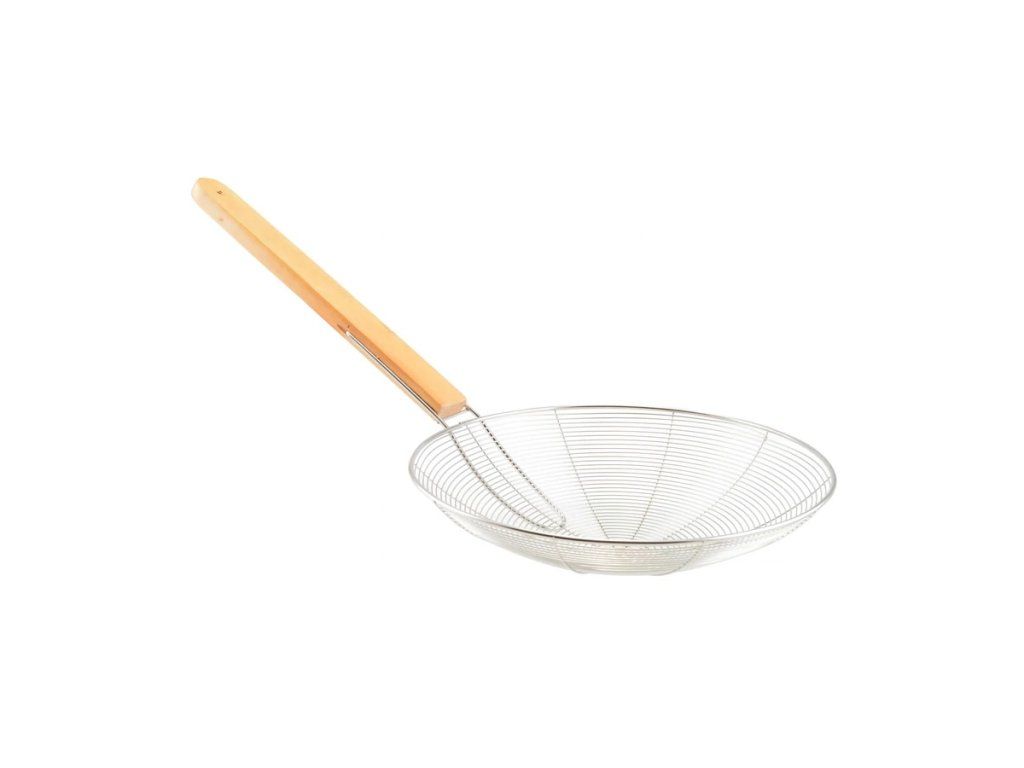 Nerezová naběračka s dřevěnou rukojetí – Ø 27 cm Praktická nerezová naběračka určená pro smažení škvarků, koblih, hranolků či jiných pokrmů připravovaných v oleji nebo sádle. Díky dlouhé dřevěné rukojeti je bezpečná a pohodlná pro manipulaci, vhodná i při domácí zabíjačce.