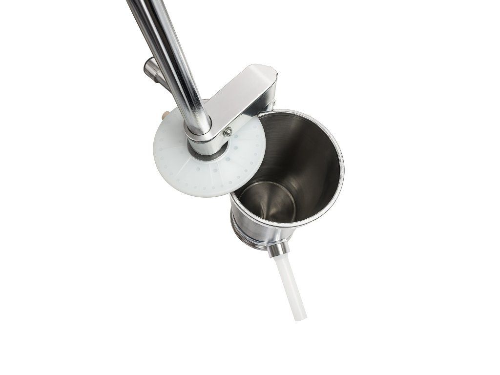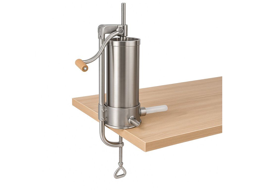 Vertikální plnička jaternic a klobás – robustní provedení pro domácí výrobu. Odolná nerezová ocel a kvalitní plastové díly – snadná montáž i čištění. Součástí 4 plastové nástavce (Ø 15, 19, 22, 25 mm) pro různé typy uzenin