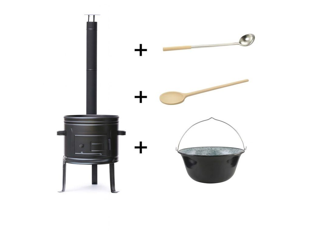 Sezónní sestava 4v1 na guláš obsahuje kotlinu s komínem, smaltovaný kotlík 8 L, nerezovou naběračku a dřevěnou vařečku. Kompletní sada pro vaření guláše a dalších pokrmů v přírodě nebo na zahradě.