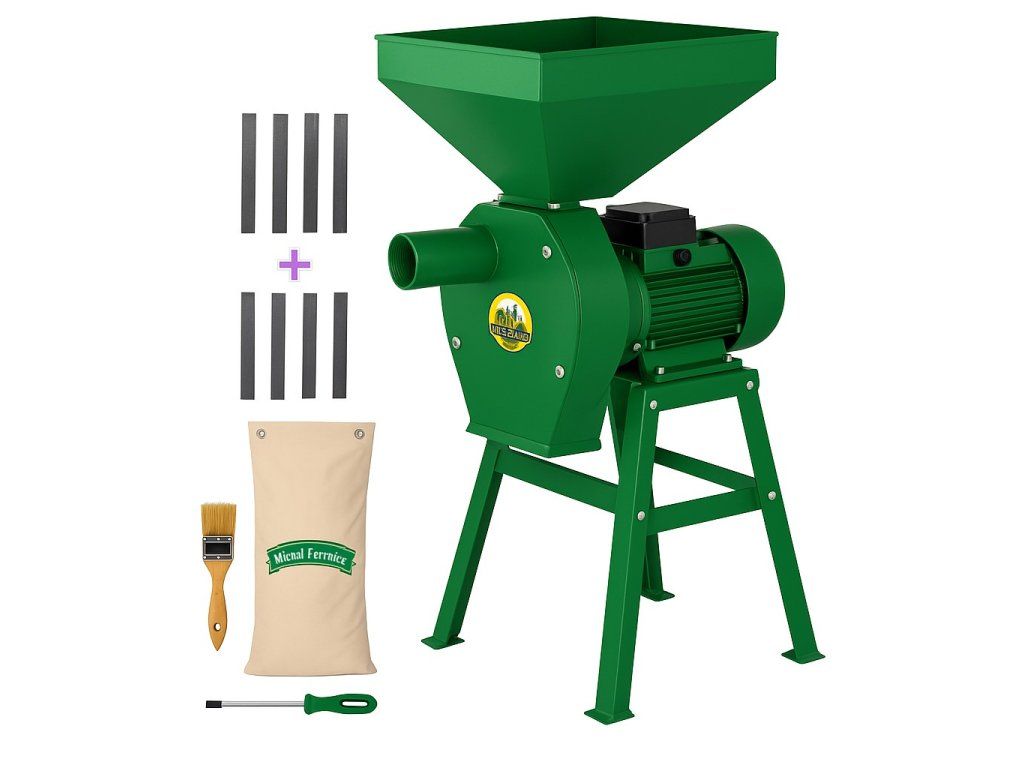 Popis: Mlýnek je vybaven silným motorem o výkonu 3,9 kW, který pohání rotor s 20 kladívky. Součástí balení je kovový stojan, čtyři vyměnitelná síta (2 mm, 3 mm, 4 mm, 5 mm) a sběrný vak pro pohodlný provoz. Vyniká nízkou hlučností, spolehlivým výkonem a jednoduchou údržbou. Ideální volba pro domácnosti, hospodářství i menší farmy.