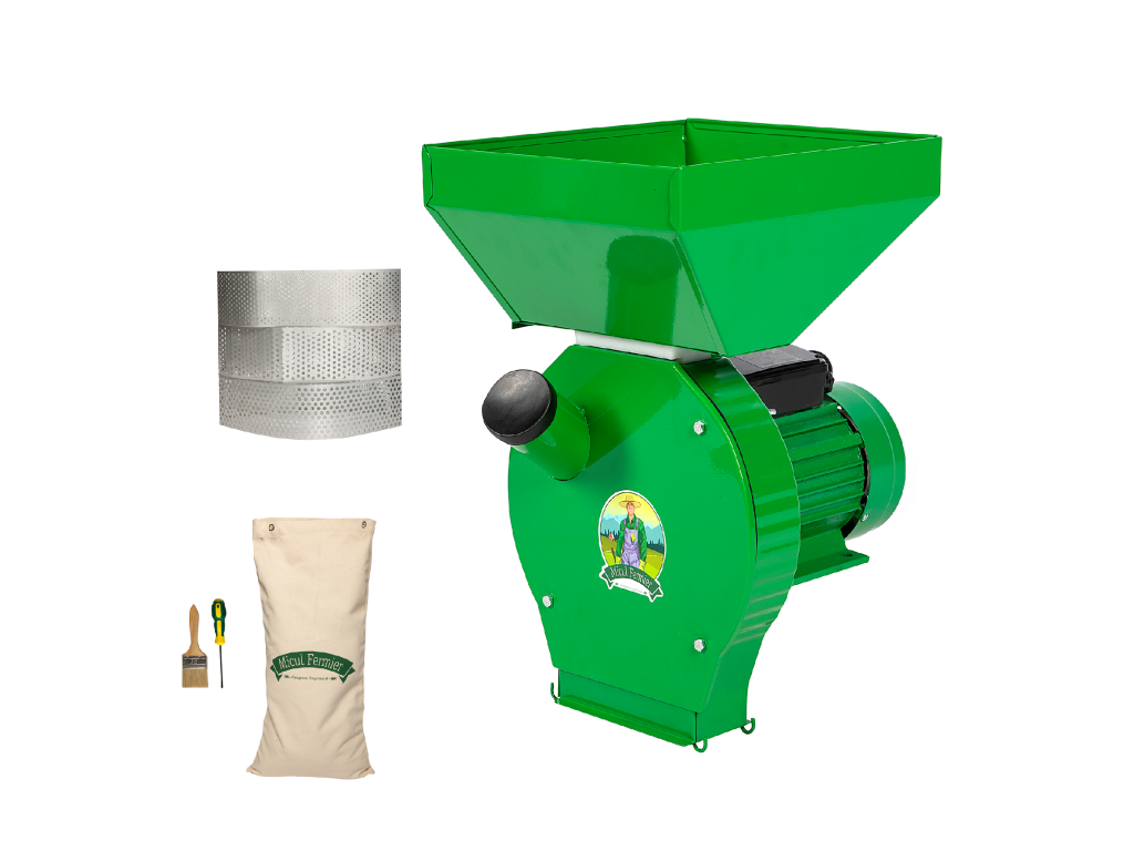 Elektrický mlýnek na obilí Micul Fermier 3,9 kW se sběrným vakem – výkonný a praktický pro mletí obilovin i kukuřičných klasů. Robustní konstrukce, velkokapacitní násypka, samostatný vstup pro kukuřičné klasy a regulace toku zrna. Elektrický mlýnek Micul Fermier s výkonem 3,9 kW a mlecím systémem s 20 kladivy zajišťuje vysokou efektivitu a čistotu provozu. Vhodný pro domácnosti i menší farmy.