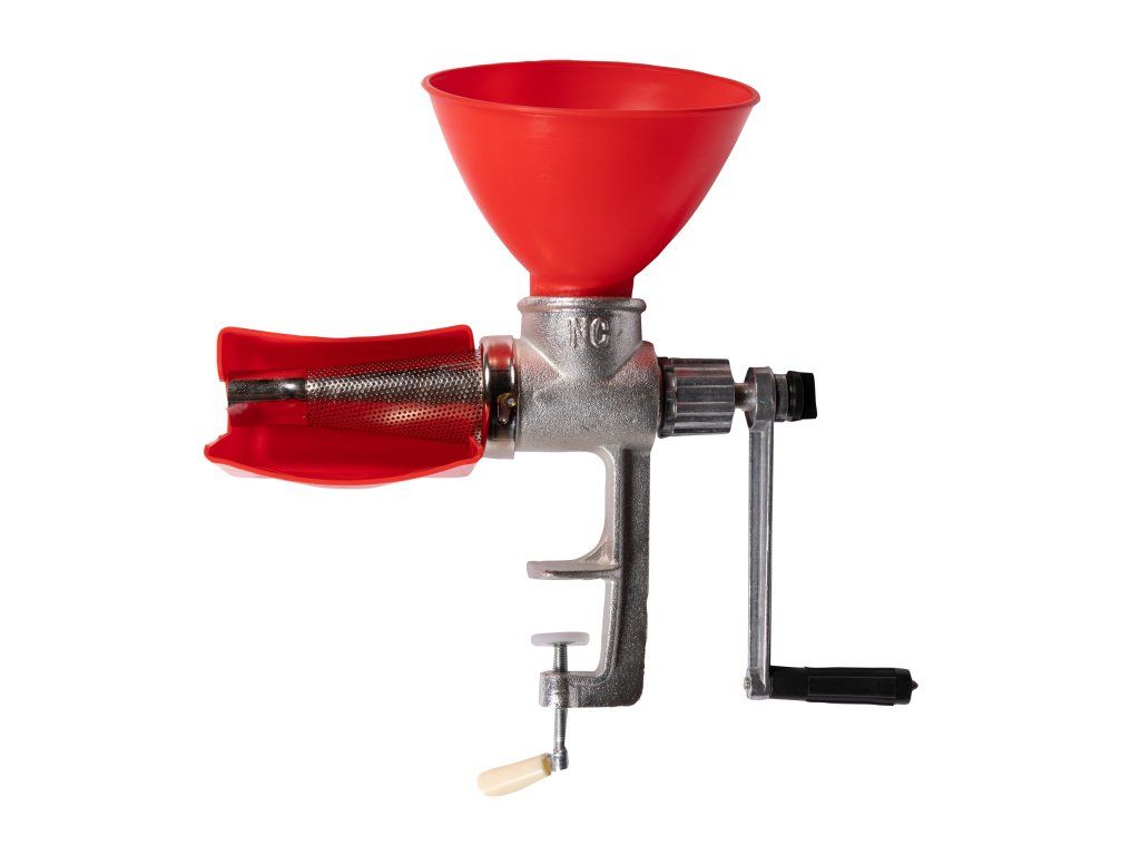 Ruční litinový mlýnek na rajčata – ideální pro přípravu domácích šťáv, pyré, omáček i džemů. Robustní konstrukce s vyměnitelným sítkem, snadné upnutí na stůl a jednoduché čištění.