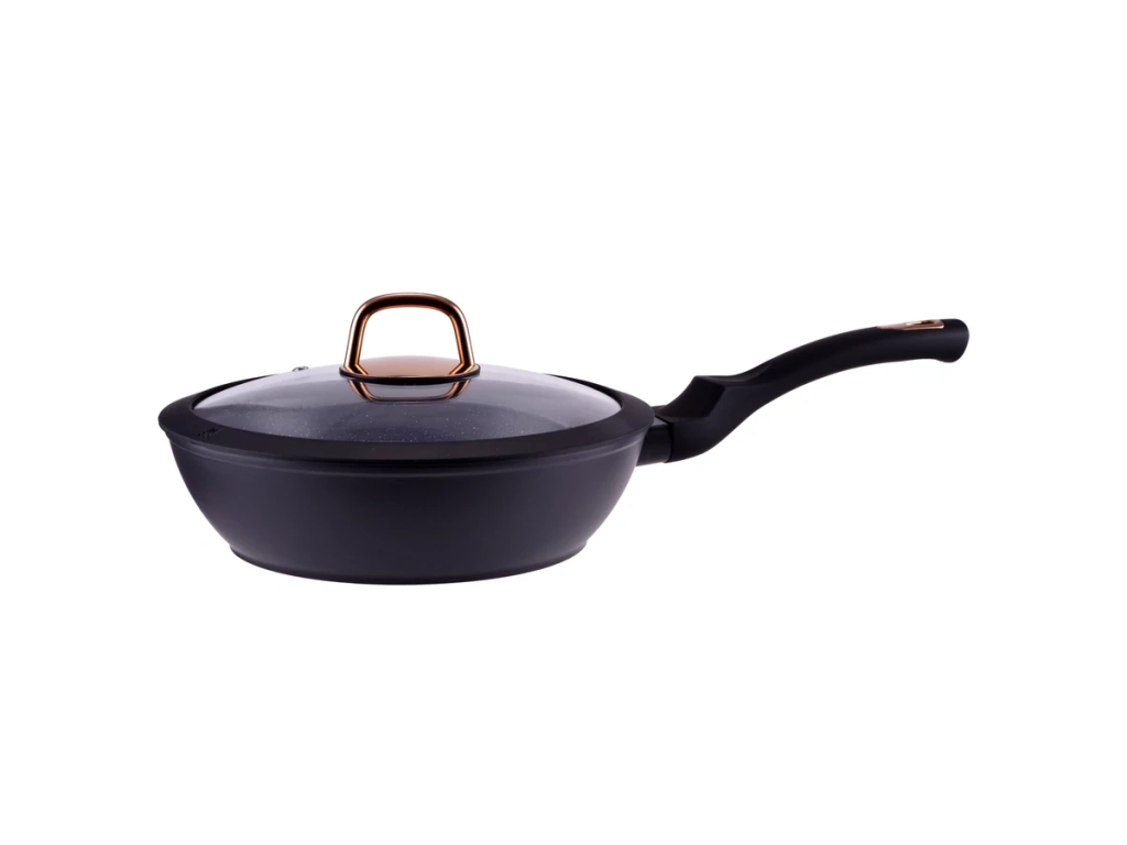 Pánev s nepřilnavým povrchem a skleněnou poklicí z kolekce Golden Line zajišťuje rovnoměrné rozložení tepla a pohodlné vaření bez připálení, vhodná pro všechny typy sporáků včetně indukce.