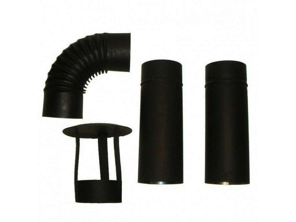 Komín pro kotlinu – kompletní SET Vyroben z pevného železa s žáruvzdorným nátěrem pro dlouhou životnost Součástí balení je trouba, koleno a klobouk