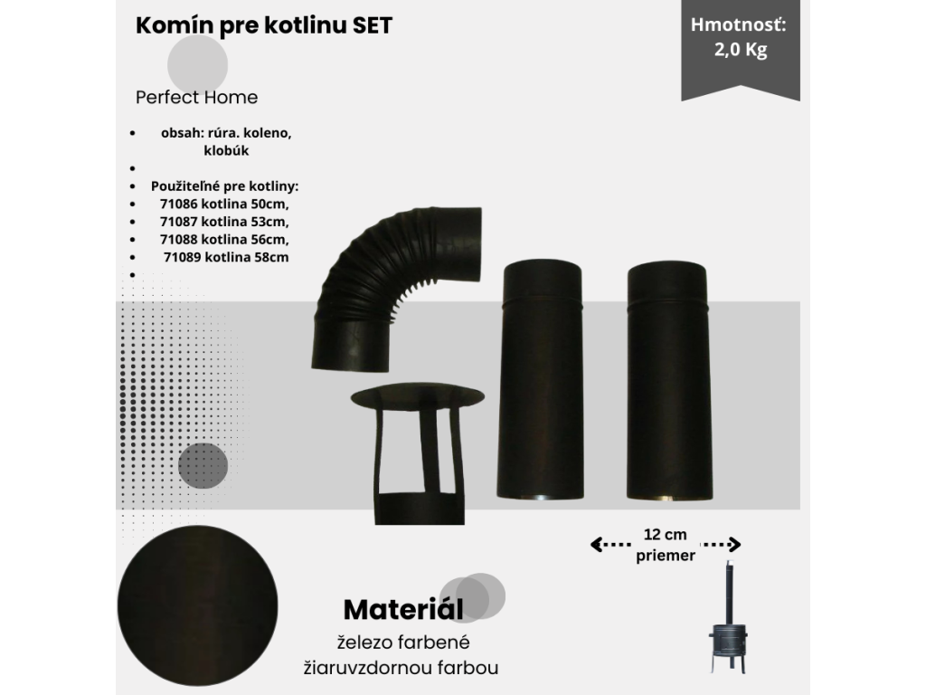 Komínový set pro kotliny z odolného železa s žáruvzdorným nátěrem. Obsahuje troubu, koleno a klobouk. Určený pro kotliny Perfect Home o průměru 50–58 cm.