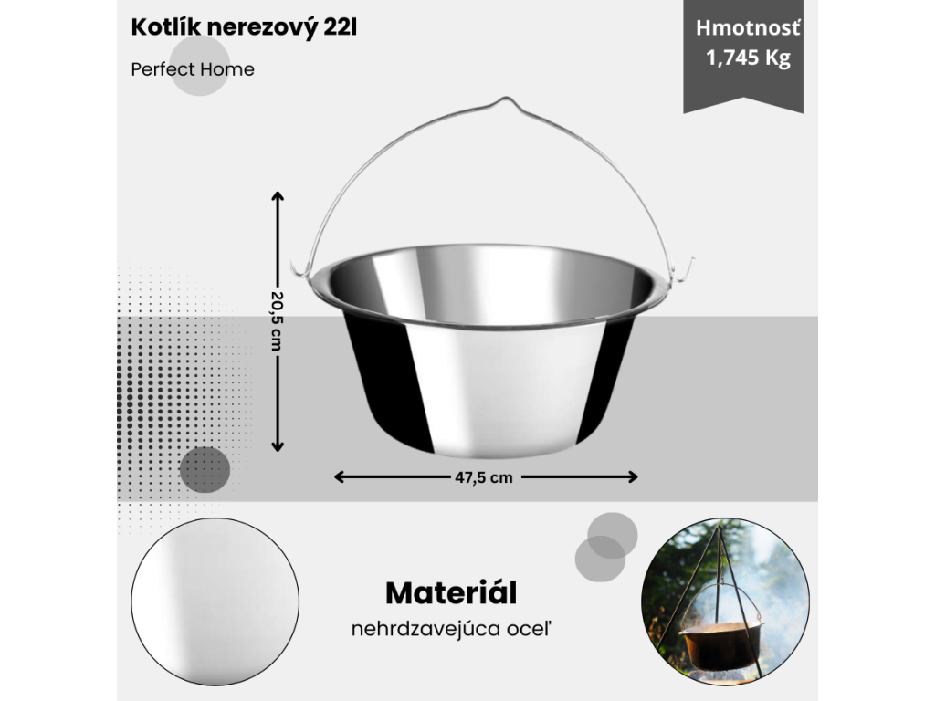 Nerezový kotlík o objemu 22l je ideální pro vaření guláše, polévek i omáček. Vhodný pro použití na otevřeném ohni. Vyroben z kvalitní nerezové oceli s dlouhou životností a snadnou údržbou.