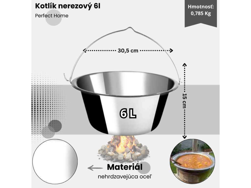Nerezový kotlík 6L Lehký a odolný nerezový kotlík ideální pro přípravu guláše, polévek a omáček Vhodný pro otevřený oheň, plynové, keramické i elektrické sporáky