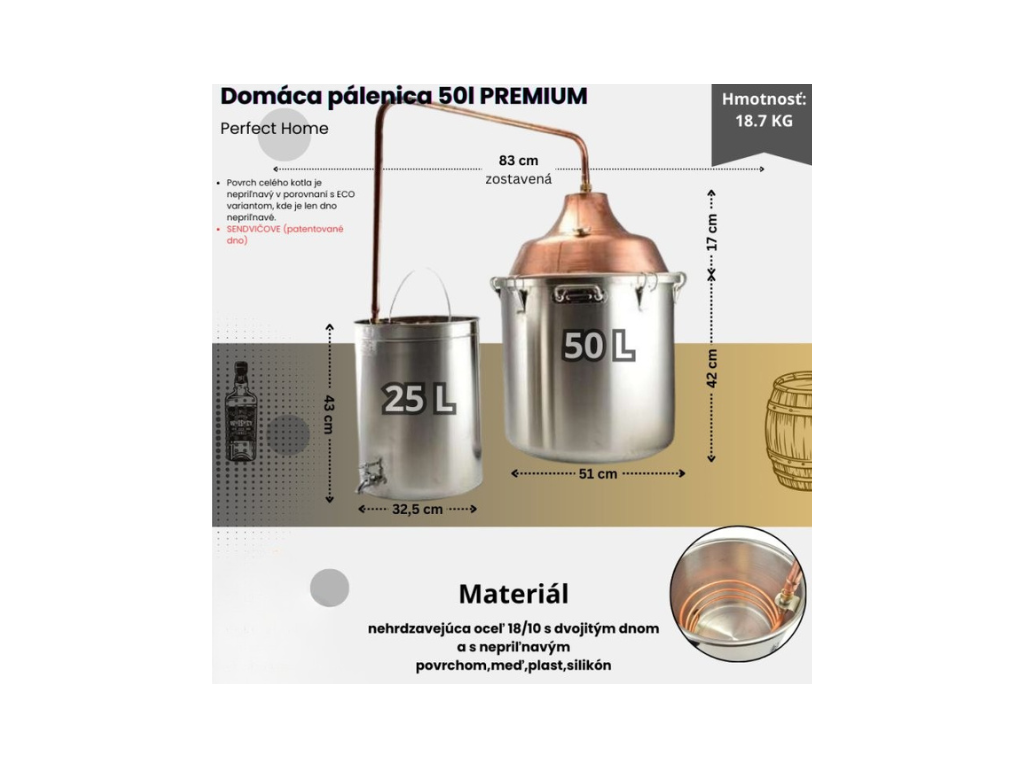 Domácí palírna 50L PREMIUM z nerezové oceli s měděnou kopulí a spirálou. Má sendvičové dno o tloušťce 2,5 cm, které zajišťuje rovnoměrný ohřev bez míchání. Vhodná pro plyn, elektřinu i tuhá paliva.