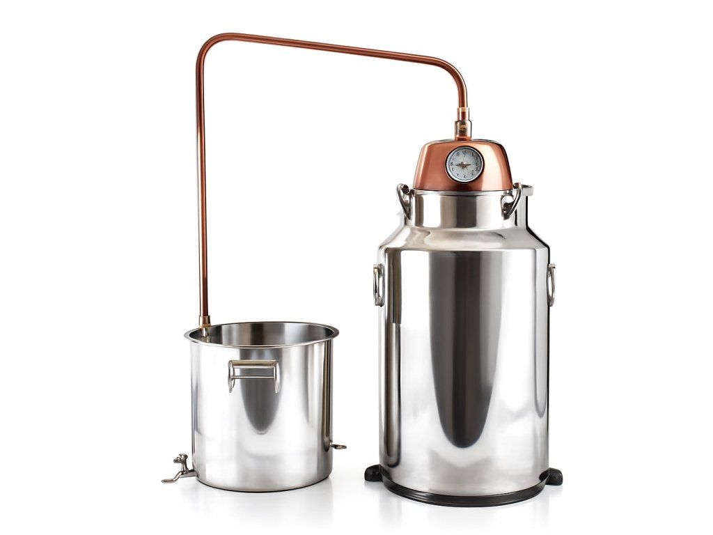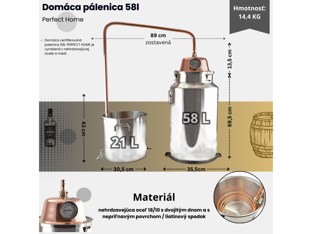 Domácí nerezovo–měděné zařízení 58l se spirálovým chlazením – Perfect Home je robustní souprava z nerezové oceli, mědi a litiny určená pro šetrné zahřívání a následné ochlazování par z ovocných směsí, výluhů či tinktur. Kombinuje velký zahřívací kotel, měděnou kupoli a chladicí nádobu se spirálou.